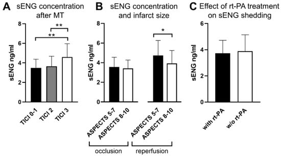 Concentration of sENG in venous plasma samples of stroke patients with LVO in the anterior circulation. Blood samples were drawn 18.2 (±8.4) hours after MT and subjected to ELISA. In the 129 patients undergoing MT, sENG levels were significantly higher after complete (TICI 3) recanalization (TICI 0–1: n = 10, 20% received rt-PA; TICI 2: n = 94, 38.5% received rt-PA; TICI 3: n = 25, and 60% received rt-PA; there was no significant difference in the ASPECT scores between these groups) (A). In patients with successful recanalization, larger infarct volumes, as reflected by a lower ASPECT score at admission, resulted in increased sENG concentrations (148 patients including 19 without MT) (B). Application of rt-PA alone or in addition to MT did not influence shedding of sENG (black bar reflects 60 patients receiving rt-PA (80% with MT); white bar shows 88 patients without rt-PA treatment (92% with MT) (C)). Graphs depict means and standard deviation. Non-parametric Kruskal–Wallis test followed by Dunn’s post-test in A, T-test by the nonparametric Kolmogorov–Smirnov test in B and C; (* p < 0.05, ** p < 0.01).
