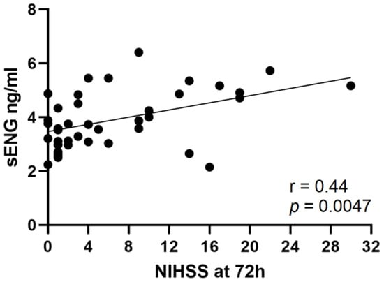 Positive correlation of sENG concentrations with the NIHSS 72 h after stroke onset in patients with partial or complete (corresponding to TICI 2C or TICI 3) recanalization. Spearman correlation coefficient (n = 39, r = 0.44, p = 0.0047).