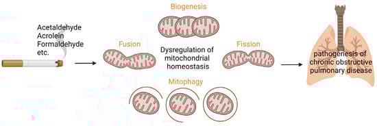 In conclusion, from the evidence provided in this review, it can be concluded that aldehydes, as components of CS, are capable of interfering with the molecular regulation of mitochondrial function and metabolism in cells of the airways and lungs which may predispose to the development of COPD. Future research is necessary to reveal the underlying molecular mechanisms and causal relationships between aldehydes, mitochondrial dysfunction, and the airway pathogenesis of COPD, which will contribute to providing insights into novel therapeutic modalities aimed at aldehydes or mitochondria.