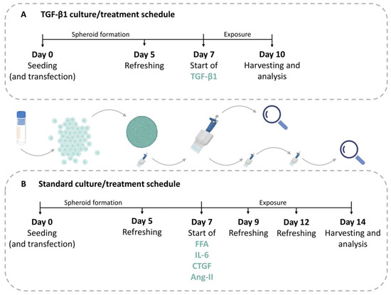 Schematic overview of experimental setup. (A) For analyses of effects of TGF-β1 treatment the cells were seeded (day 0) and cultivated to form spheroids for 5 days when the first medium refreshment occurred. TGF-β1 treatment started on day 7 and lasted for 3 days, after which the spheroids were harvested. When required, siRNA and transfection reagents were added during seeding at day 0 to achieve a high transfection efficiency. Following transfection, the cells were treated as above. (B) In the standard treatment schedule, the cells were seeded on day 0 and the first medium refreshment took place on day 5. All treatments of FFA, IL-6, CTGF, or angiotensin II (Ang-II), started on day 7 and lasted for 7 days. Medium and compounds were refreshed every 2 to 3 days, until the spheroids were harvested. In experiments, where cells were transfected, this took place on day 0 along with the seeding procedure. TGF-β1—transforming growth factor beta 1; FFA—free-fatty acids; IL-6—interleukin 6; CTGF—connective tissue growth factor; Ang-II—angiotensin II. Parts of the figure were created with BioRender.com.