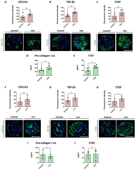 FFA and IL-6 treatment increase fibrosis markers and CTGF production in co-cultures. Red bars represent results of IHC analysis and green bars represent data based on ELISA analyses. (A–C) Treatment of co-culture spheroids with FFA increased production of COL1A1, TGF-β1 and CTGF in the spheroids (n = 4). (D,E) FFA treatment increased pro-collagen I α1 and CTGF released from the cells into the medium during the last 2 days of culture (n = 4). (F–H) Treatment of the spheroids with 1.5 ng/mL of IL-6 for 7 days increased production of COL1A1, TGF-β1 and CTGF (n = 3), (I,J) but not of pro-collagen I α1 and CTGF production monitored by ELISA (n = 3). Every dot in the plots represents data from 1 experiment. Every dot in the red bars represents an average of at least 10 analyzed sections of spheroids per experiment. The size of the spheroids is marked with a white scale bar of 100 μm. Data are shown as mean ± SEM. Statistical analysis—Student’s t-test; * p < 0.05; ** p < 0.01; ns: not significant.