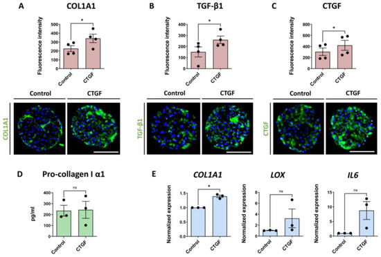 CTGF contributes to liver fibrosis in the 3D liver co-culture fibrosis model. Blue bars represent mRNA expression data. Red bars represent results of IHC analysis and green bars represent data based on ELISA analyses. (A–C) CTGF treatment significantly increased the production of COL1A1, TGF-β1 and CTGF, as revealed by IHC (n = 4); (3 experiments with PHH donor 1 and 1 experiment with PHH donor 2; NPC from donor 3 were used in all 4 experiments). (D) Pro-collagen I α1 release was not affected by the CTGF treatment (n = 3) (E) COL1A1, LOX and IL6 mRNA levels were increased after a 7-day CTGF treatment, although the changes in LOX and IL6 expression did not reach statistical significance (n = 3, 2 experiments with the PHH donor 1 and 1 experiment with PHH donor 2; NPC from donor 3 in all 3 experiments). Every dot represents data from 1 experiment. Every dot in the red bars represents an average of at least 10 analyzed sections of spheroids per experiment. The size of the spheroids is marked with a white scale bar of 100 μm. Data are shown as mean ± SEM. Statistical analysis—Student’s t-test; * p < 0.05; ns: not significant.