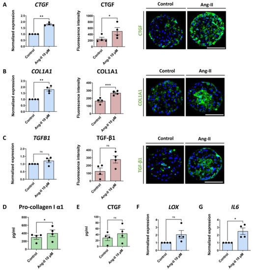 Angiotensin II induces CTGF production and markers of liver fibrosis. Angiotensin II was used to increase CTGF production and induce fibrosis in liver spheroids. Blue bars present the mRNA level data, red bars, results of IHC analysis, and green bars, data acquired using ELISA. (A) Angiotensin II caused an increase in CTGF expression (n = 4; 3 experiments with the PHH donor 1 and 1 experiment with PHH donor 2; NPC from donor 3 in all 4 experiments) and production (n = 4; 3 experiments with the PHH donor 1 and 1 experiment with PHH donor 2; NPC from donor 3 in all 4 experiments). (B) Expression and protein production of COL1A1 increased after angiotensin II treatment (n = 4). (C) TGF-β1 was increased on the protein level (n = 4), however the transcriptional level was unaffected (n = 4). (D) Pro-collagen I α1 released from the cells increased during the last 2 days of culture of the angiotensin II-treated spheroids (n = 4). (E) Similarly, the CTGF concentration in the culture medium was increased in all 4 experiments, although not to a significant extent (n = 4). (F,G) LOX and IL6 mRNA expression increased due to angiotensin II treatment (n = 4; 3 experiments with PHH donor 1 and 1 experiment with PHH donor 2; NPC from donor 3 in all 4 experiments). Nuclei in the IHC images are shown in blue. Every dot in the plots represents data from 1 experiment. Every dot in the red graphs is the average of at least 10 analyzed sections of spheroids per experiment. The size of the spheroids is marked with a white scale bar of 100 μm. Data are shown as mean ± SEM. Statistical analysis—Student’s t-test; * p < 0.05; ** p < 0.01; *** p < 0.001; ns: not significant. Ang-II—angiotensin II.
