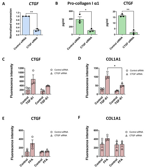 The role of CTGF in the fibrotic model was also investigated by gene silencing. Following transfection with CTGF siRNA, CTGF mRNA expression was reduced by ~70% compared to control siRNA (Figure 6A). CTGF silencing significantly decreased baseline pro-collagen I α1 production in the medium, as well as CTGF production (Figure 6B). The TGF-β1-induced CTGF production was largely suppressed after CTGF silencing (Figure 6C). A similar impaired production of COL1A1 was observed after TGF-β1 treatment (Figure 6D). In accordance, although less pronounced, was the reduced increase of CTGF due to FFA treatment after CTGF silencing (Figure 6E). The latter translated into COL1A1 production even upon FFA treatment as well (Figure 6F). CTGF silencing in the FFA-induced fibrosis caused a relatively less pronounced decrease in COL1A1 production than observed in TGF-β1-induced fibrosis, indicating a higher contribution of CTGF-independent signal transduction processes for development of fibrosis after FFA treatment.