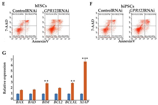 A change in the cell proliferation profile from the one that is generally attributed to somatic cells to a faster and shorter hESC-like cycle is a prerequisite of successful iPSC generation [15]. We employed flow cytometry to examine the cell cycle profile of the control and GPR123 RNAi hESCs (Figure 4A). In agreement with the discovered downregulation of the pluripotency markers’ gene expression, we observed that on the 3rd day of transfection, about 50% of the GPR123 RNAi cells demonstrated accumulation at the G2 phase of the cell cycle in contrast to control RNAi cells (Figure 4A). This was further supported by the drop in expression of the D-type cyclins and cyclin E and by the rise of the important regulator of the G2 phase progression, cyclinB1 (Figure 4B,C). Observed downregulation in the expression level of all three main phosphatases, namely, CDC25A, CDC25B, and CDC25C, which governed cell cycle progression from one stage to another, suggests that the cell cycle slows down (Figure 4D). Previously, we showed that cell cycle alteration accompanied by the downregulation of the pluripotency gene expression and accumulation of hESCs at the G2 phase of the cell cycle may not lead to increased cell death and apoptosis induction [16]. We used flow cytometry to examine the level of 7-AAD and AnnexinV in GPR123-RNAi-treated hESCs and hiPSCs (Figure 4E,F) and as expected found no significant difference in the rate of apoptosis between the control RNAi and GPR123 RNAi groups in both cell types. Further qRT-PCR revealed upregulation of the pro-apoptotic BCL2-family gene expression, namely, the BIM gene, in the GPR123 RNAi group with contaminant upregulation of Bcl-xL, which functions to inhibit apoptosis by a number of different mechanisms including inhibition of Bax. In addition, the X-linked inhibitor of apoptosis protein (XIAP), the most potent and best-defined anti-apoptotic IAP family member, appears to be significantly upregulated in GPR123 RNAi cells, suggesting that the fine balance between pro-and anti-apoptotic genes was maintained during the suppression of GPR123 gene expression (Figure 4G). These data are consistent with the idea that hPSCs prefer a differentiation pathway to apoptosis induction for eliminating cells with a reduced level of pluripotency [17].