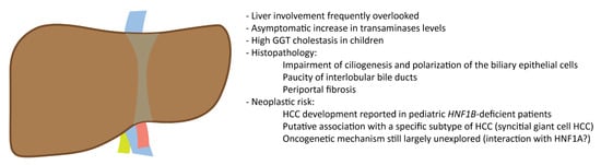 The association of HNF1B deficiency with the development of primary liver cancer is largely unexplored. Single nucleotide polymorphisms (SNPs) of HNF1B have been identified and associated through genotyping arrays with cancer development. HNF1B somatic mutations were observed in several human cancers, among which hepatocellular carcinoma (HCC), confirming further, as previously discussed, its role as an oncogene/tumor suppressor gene []. Nevertheless, the association of HCC with germline HNF1B deficiency is largely uncharted [,]. However, although at a very low risk, HNF1B deficiency may be associated with HCC, as in some PFIC disorders. Interesting enough, although HNF1B deficiency mainly affects the biliary epithelium, only HCC but not cholangiocarcinoma, has been observed so far. HCC is the second most common malignant liver tumor in children after hepatoblastoma. Both hepatoblastoma and HCC account together for the 0.5–1.5% of all childhood malignancies and for the 4% of all pediatric liver transplantations []. It differs from adult HCC with respect to the etiological predisposition, biological behavior, and lower frequency of cirrhosis. HNF1A mutations occur in 1–2% of HCC.
