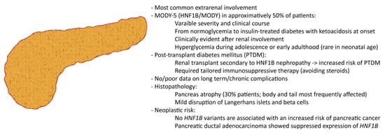 The mechanism of tumor development related to reduced HNF1B levels appeared to be related to a hypermethylation of the promoter region, eventually leading to: (i) loss of the adhesion molecule E-cadherin in neoplastic cells, (ii) expanded epithelial-to-mesenchymal transition, and (iii) increased tumor cell migration [,]. However, no variants of HNF1B have been hitherto associated with an increased risk of pancreatic cancer development []. The main features of pancreatic involvement in HNF1B deficiency are summarized in Figure 3.