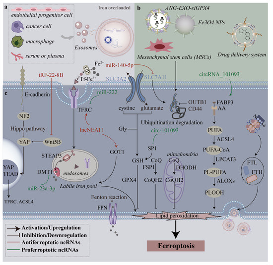 Mechanisms through which different sources of exosomes regulate ferroptosis. (a), In the iron-overloaded milieu, many types of cells and even serum or plasma release endogenous exosomes that affect ferroptosis. (b), Various exosomes derived from mesenchymal stem cells (MSCs) and engineering exosomes can be used to treat diseases by modulating ferroptosis. (c), Exosome-derived ncRNAs regulate multiple intracellular ferroptosis pathways to promote or inhibit ferroptosis.