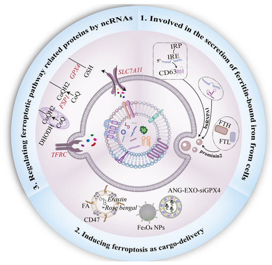The ferroptosis-related pathogenesis of diseases is always accompanied by an imbalance in intracellular iron homeostasis, dysfunction in lipid oxide metabolism, and by low cellular antioxidative capacity. Although the complex mechanism underlying ferroptosis in diseases is still not completely understood, exosomes regulate proteins related to the ferroptosis pathway by delivering molecular entities (ncRNAs and proteins) or trafficking ferritin-bound iron in a paracrine manner (Figure 2). Thus, researchers must investigate the role of exosomes in ferroptosis-related pathogenic mechanisms.