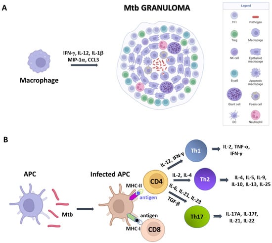 A simplified sketch of Mtb-induced immune reaction. (A) macrophages produce cytokines which recruit other immune cells to form the Mtb granuloma. In these structures, macrophages can differentiate in other cell types, like epithelioid cells, giant cells, and foamy macrophages. (B) Antigen presenting cells (APCs) expose antigens on their MHC molecules, thus bringing them to T cells CD4 and CD8. Cytokine production by APCs induce T cell differentiation. Created with BioRender.com, accessed on 20 December 2022.