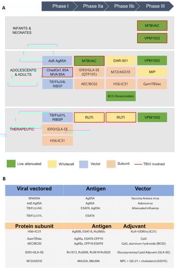 A schematic view of TB antigens in clinical trials. (A) Summary of TB vaccine candidates currently in clinical trials, updated to October 2022 (https://www.tbvi.eu/what-we-do/pipeline-of-vaccines/, accessed on 20 October 2022). (B) specific antigens encoded in viral vectored vaccines (top) and contained in protein subunit vaccines, along with their adjuvants (bottom).