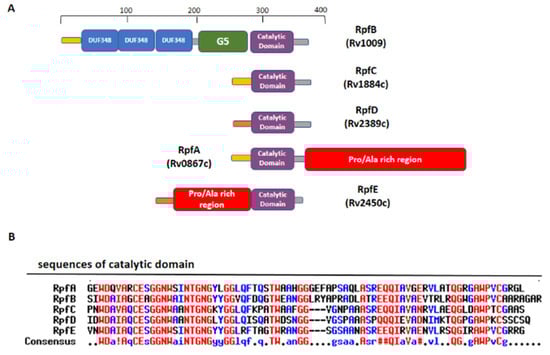 Domain composition of Mtb Rpfs. (A) A schematic view of domain composition in RpfA-E. (B) Sequence alignment of catalytic domains of the five Rpfs, computed with the MultAlin tool (high- and the low-consensus residues are indicated in red and blue, respectively).