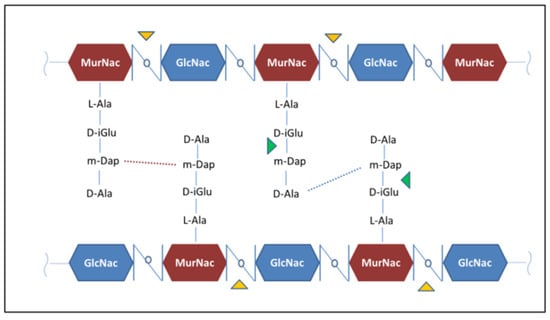 The chemical structure of Mtb peptidoglycan. Hydrolysis sites operated by Rpfs and RipA are highlighted by the yellow and green triangles, respectively.