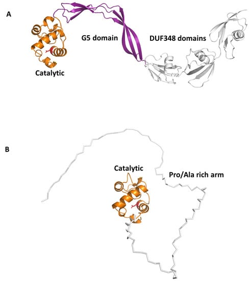 AlphaFold structures of antigenic Rpfs. (A) Cartoon representation of RpfB computed in a template-based mode using the crystal structure 5e27 as a template [,]; catalytic, G5 and DUF348 domains are drawn in orange, purple and grey, respectively. (B) Cartoon representation of the reliable region of RpfE structure, the catalytic domain in orange. The Pro/Ala rich arm, depicted using a ribbon representation, is highly flexible and was computed by AlphaFold with low reliability (pLDDT < 70).