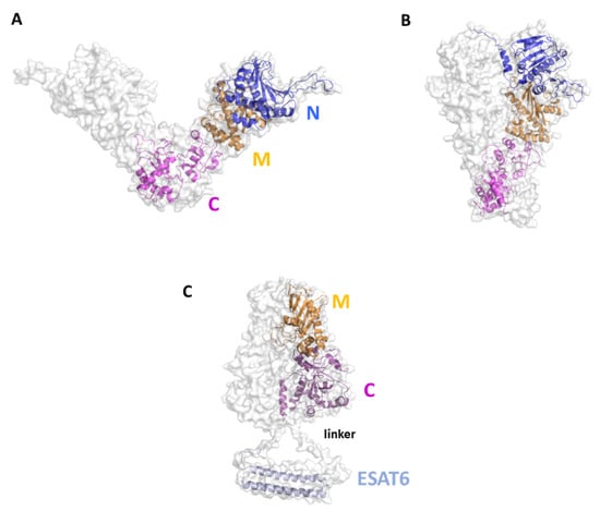 Although no experimental structures of HtpGMtb are still available, computational approaches showed that HtpGMtb presents a highly stable dimeric structure, where each monomer is composed of three domains []. A large conformational flexibility was associated to the proposed clamping mechanism needed for the chaperon function of HtpGMtb. Moving from an open state to a collapsed state, HtpGMtb can efficiently bind proteins to fold, and then release it when the folding process is finished [,,] (Figure 8A,B). Using a SV approach, we predicted and experimentally confirmed that the most immunoreactive regions are located on the C-terminal and middle domains, whereas the N-terminal catalytic domain plays no role in elicitation of the immune response. These findings led us to design of new vaccine antigen candidates with enhanced biophysical properties and easier to produce, albeit conserved or enhanced antigenic properties []. Importantly, the antigen obtained upon conjugation of the C-terminal and Middle domains with ESAT6 (HtpG-MCMtb-ESAT6), Figure 8C, was more immunoreactive than the full-length HtpGMtb-ESAT6. Indeed, T cells activated by DCs matured with HtpG-MCMtb-ESAT6 induced best Mtb growth inhibition in macrophages [].