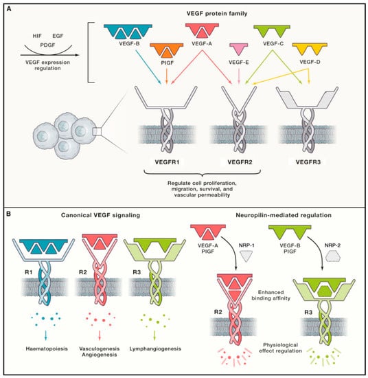Schematic diagram of interactions between VEGFs and VEGFRs known to mediate hemangiogenesis and lymphangiogenesis. (A) The five major VEGFs expressed in mammals identified to date include VEGF-A to -D and placental growth factor (PlGF). VEGF-E is virally encoded. Each VEGF subtype interacts with either one or two of the three known VEGFRs to influence cell proliferation, migration, survival, and vascular permeability. VEGF expression is regulated by various factors, including hypoxia-inducible factor (HIF), epidermal growth factor (EGF), and platelet-derived growth factor (PDGF). (B) Canonical VEGF–VEGFR signaling mediates vasculogenesis, hemangiogenesis, lymphangiogenesis, and hematopoiesis. Vascular endothelial cells express VEGFR-1 and -2, and VEGF-A/VEGFR-2 signaling is the primary driver of hemangiogenesis. LECs express VEGFR-2 and -3, and VEGF-C and -D/VEGFR-3 interactions are the main drivers of lymphangiogenesis. Neuropilin-1 and -2 (NRP-1/-2) act as coreceptors for VEGFR-2 and -3, respectively, increasing the affinity of VEGF–VEGFR binding [104]. Reproduced with permission.