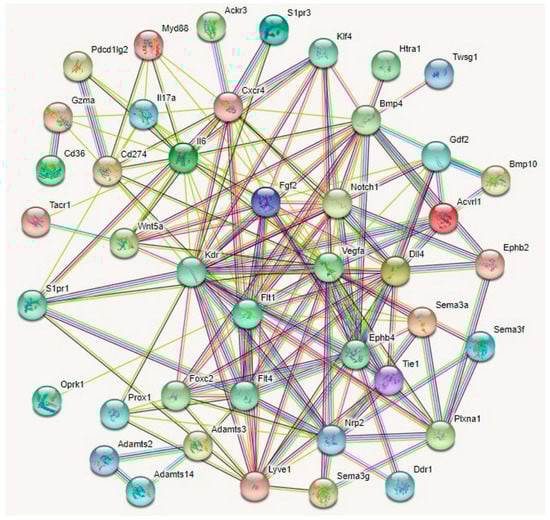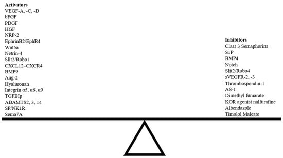 The VEGF family and its associated cognate receptors (VEGFRs) are among the most important regulators of lymphangiogenesis. VEGFRs are primarily expressed in endothelial cells, and VEGFs are primarily secreted by inflammatory cells such as macrophages [103]. VEGF-A, -C, and -D in particular have been identified as key factors involved in inducing and sustaining hemangiogenesis and lymphangiogenesis [11]. VEGFR-2 and -3 are key endothelial cell receptors that respond to VEGF-A, -C, and -D [18]. VEGF-A interacts with both VEGFR-1 and -2, VEGF-C with both VEGFR-2 and -3, and VEGF-D with both VEGFR-2 and -3 (Figure 3) [18].
