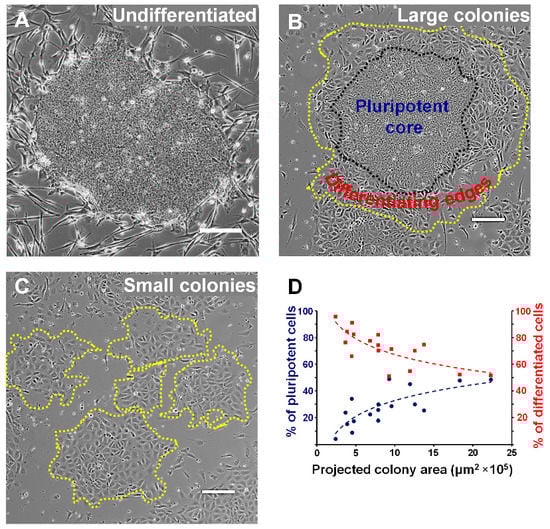 Interestingly, for a smaller colony size (<5 × 105 μm2), the pluripotent core disappeared, and the differentiation efficiency increased significantly (Figure 1C,D). In other words, a smaller colony size (<5 × 105 μm2) reduces cellular heterogeneity during differentiation. Figure 1D shows the percentage of colony cells with a pluripotent or differentiated morphology as a function of the projected colony area. When the colony size was small (~up to 5 × 105 μm2), more than ~90% of the cells within the colony appeared differentiated (red line) while only ~10% of the cells within the colony appeared pluripotent (blue line) (Figure 1D). When the colony size progressively increased, the percentage of differentiated cells decreased with a concomitant increase in the percentage of pluripotent cells.