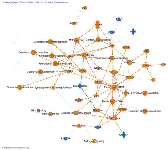 KEGG and IPA pathway analyses of differentially expressed genes in EtOH-fed males compared to their counterpart females suggested that neurological-disorder-related pathways were enriched (Tables S3 and S4). A list of the top enriched KEGG pathways (Figure 1B) and GSEA plots of known neurological-disorder-related pathways are available in Figure 1C–F. We further analyzed differentially expressed genes using IPA and reconfirmed the enrichment of neurological and psychological disorders (Table 1, Figure 2, and Table S4). A positive net enrichment score (NES) in the GSEA-based pathway analysis (Figure 1A,C–F) and Z-score in the IPA analysis (Figure 2 and Figure S2) suggest that neurological- and psychological-disorder-related pathways were upregulated in male offspring compared to female offspring.