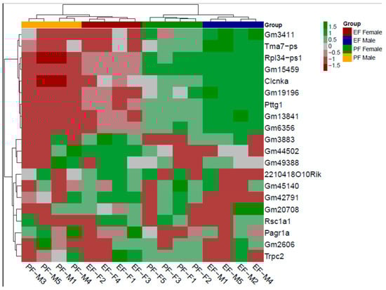 Unsupervised hierarchical clustering of most variable 30 genes in samples (columns) based on median absolute deviation (MAD). These 30 genes had the most variability across all models. The green color in the heatmap indicates a higher expression level, and red indicates a low expression level. In groups, each color represents the respective groups, as explained in the legend (M—male; F—female).