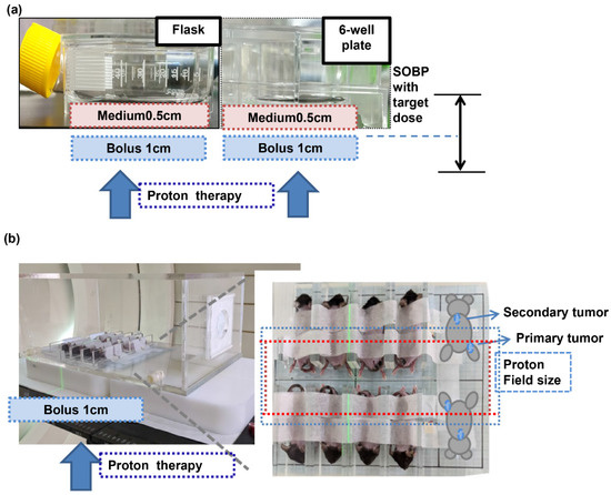 The relative biological effectiveness of protons was set at 1.1, and the relative biological effectiveness (RBE) dose was calculated by multiplying the proton dose by this value [19]. In the present study, we used the RBE dose to evaluate the effect induced by RT. Dosage in proton radiotherapy is prescribed as Gy (RBE) by scaling up the physical dose by 10%, i.e., the proton RBE dose = the physical proton dose × 1.1. Cells and mice received local RT either by photon or PT irradiation with the RBE dose. Photon irradiation was performed using Varian 21EX and Eclipse treatment planning. In vitro, exponentially growing cells were irradiated with single doses of 0, 3, 6, and 9 Gy using a 6 MV beam for photon radiation analysis. For PT, irradiation by pencil beam scanning (PBS) was performed at different proton doses (0, 3, 6, 9, and 12 Gy (RBE)), with an energy corresponding to 93.6–109.2 MeV and 72–143.2 MeV for cells and mice, respectively. Cell and mouse irradiations were conducted by placing the cells at the middle of the spread-out Bragg peak (SOBP; 1 cm width for cell PT, 6 cm width for mouse PT irradiation) to simulate clinical conditions (Figure 1a,b). Proton irradiation was delivered by the cyclotron used at our hospital (Sumitomo Heavy Industries, Ltd., Tokyo, Japan), which generates a continuous and high-intensity proton beam. The RT field size was 20 × 10 cm2 to examine abscopal effect, 20 × 15 cm2 to examine the tumoricidal effect of PT in vivo, or 20 × 20 cm2 to examine the effect of PT in vitro. Ray Station was the treatment planning system used for RT dose calculation (version 8.1, Ray Search Laboratories, Stockholm, Sweden).