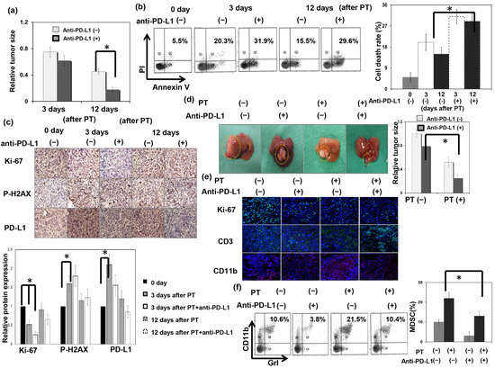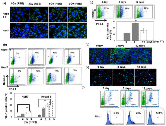 Effect of PT on PD-L1 expression. The levels of PD-L1 were evaluated using (a) IF (DAPI, blue; PD-L1, green), and (b) FACS staining for human and murine liver cancer cells at 48 h after PT in vitro and (c) FACS and (d) IF for murine liver tumors at the indicated times after PT for 12 Gy (RBE) in vivo. The y axis is the relative fold change in PD-L1 expression at the indicated conditions after PT. Data are presented as means ± standard errors of the mean. * p < 0.05. Furthermore, the expression of PD-L1 in murine CD11b+ cells following PT irradiation was evaluated via (e) IF and (f) FACS analysis (CD11b+ cells, blue spots).