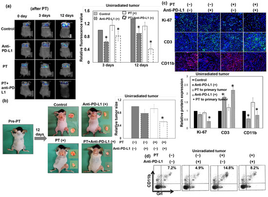 Radiation has been reported to induce abscopal effects on distant, untreated cancer sites that are amplified by the use of immunomodulating drugs [32,33,34]. Accordingly, we further examined the abscopal effect induced by PT on liver tumors and the impact of combined treatment with the anti-PD-L1 antibody. As shown in Figure 7a,b and Supplementary Figure S1, application of local PT to the tumor alone induced smaller tumors with lower glucose metabolism in irradiated tumors over the right thigh, but showed no significant tumor inhibition on the secondary unirradiated tumors in the upper back, compared with the sham-RT group. Combined treatment with the anti-PD-L1 antibody immediately after PT enhanced the tumoricidal effect in the PT-irradiated field and resulted in the regression of secondary tumors outside of the irradiated field. Analysis of tumor-infiltrating immune cells showed that anti-PD-L1 attenuated MDSC recruitment, increased CD3+ TILs, and decreased cell proliferation in unirradiated tumors (Figure 7c,d) of mice that received local PT to primary tumors. These results suggest that anti-PD-L1 enhanced the antitumor immune response and augmented the abscopal effect in immunocompetent hosts following local PT irradiation.