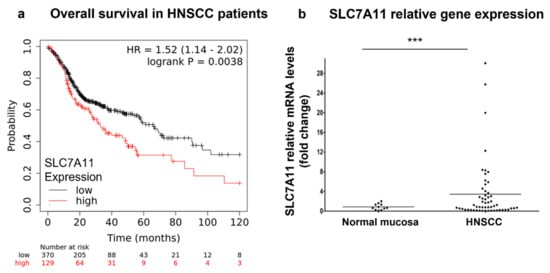 xCT (SLC7A11) expression in patients with HNSCC. The prognostic value of xCT (SLC7A11) mRNA was evaluated in patients with HNSCC using the KMplot database (https://kmplot.com/analysis/), and correlation between the levels of xCT (SLC7A11) and overall survival rate is displayed on the plot diagram (a). Relative xCT (SLC7A11) mRNA levels in tissue specimens of patients with HNSCC and control healthy mucosa were determined using real-time PCR analysis (b). Relative quantities of the transcripts were calculated via pairwise differences of threshold cycles (∆CT) of the SLC7A11 gene and the loading control GAPDH housekeeping gene. *** p < 0.001.