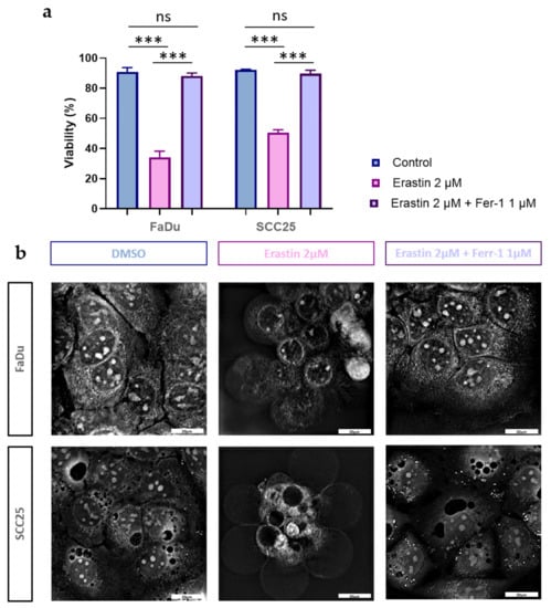 Effects of erastin and ferrostatin-1 on viability and morphology of HNSCC cells. Cell viability was determined in FaDu and SCC25 cells at 72 h after treatment with erastin (2 µM) or combination of erastin (2 µM) and ferrostatin-1 (1 µM). DMSO was used as a vehicle control. Columns represent the mean + SEM calculated after at least three independent experiments, *** p < 0.001 (a,b) Morphological characteristics of ferroptotic cell death in HNSCC FaDu and SCC25 cells were evaluated using holotomographic microscopy (Nanolive SA 3D-Explorer-FLUO, Tolochenaz, Switzerland) as described in Materials and Methods. Cells were treated with erastin (2 µM) or a combination of erastin (2 µM) and ferrostatin-1 (1 µM), and at 72 h after treatment, the representative images were obtained; 60× magnification, bar: 20 µm.