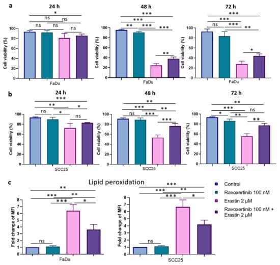 Cell viability and lipid peroxidation in FaDu and SCC25 HNSCC cells in response to erastin and ravoxertinib exposure. FaDu (a) and SCC25 (b) cells were treated with erastin (2 µM), ravoxertinib (100 nM), or their combination, and cell viability was detected at 24, 48, and 72 h, as described in Materials and Methods. Lipid peroxidation was studied via flow cytometry analysis of the oxidized C11-BODIPY (581/591) in HNSCC cells at 24 h after treatment with erastin (2 µM), ravoxertinib (100 nM), or their combination (c). Data are given as mean + SD (a,b) or mean + SEM (c) obtained from at least three independent experiments, * p < 0.05, ** p < 0.01, *** p < 0.001.