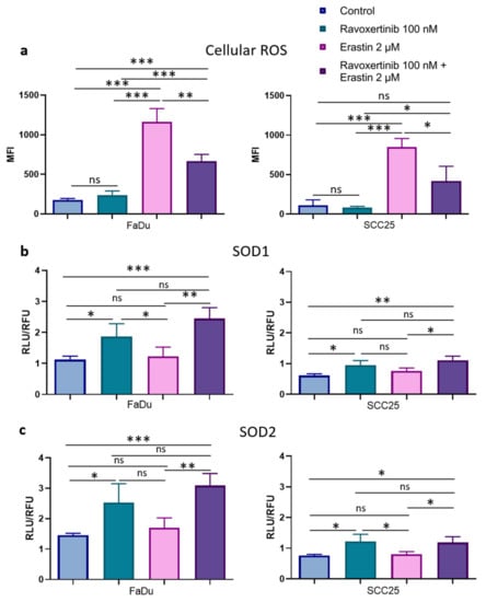 ROS production and expression of ROS scavengers, SOD1, and SOD2 in HNSCC cells. Flow cytometry analysis of the HNSCC cells stained with DCFDA fluorogenic dye was used to measure hydroxyl, peroxyl, and other ROS activities in FaDu and SCC25 cells 24 h after treatment with erastin (2 µM), ravoxertinib (100 nM), or their combination (a). Expression levels of ROS scavengers SOD1 (b) and SOD2 (c) were evaluated using the Promega Lumit™ Immunoassay Cellular System (see Materials and Methods) 24 h after treatment with erastin (2 µM), ravoxertinib (100 nM), or their combination. Data are given as mean + SD (a) or mean + SEM (b,c) obtained from at least three independent experiments, * p < 0.05, ** p < 0.01, *** p < 0.001.
