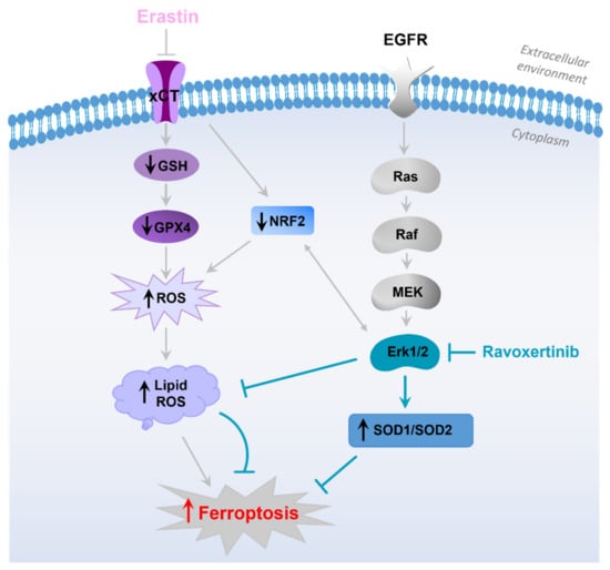 Ferroptosis was first described in 2012, and it was shown that this type of cell death was caused by iron-induced lipid peroxidation []. In order to achieve an optimal induction of lipid peroxidation, detoxifying intracellular machinery should be downregulated []. Currently, a number of molecules have been described to be implicated in the suppression of ferroptosis development, such as GSH, GPX4, and Nrf2 [,,,]. However, later experimental research allowed us to observe that lipid peroxidation can be triggered by other stimuli []. Thus, either constitutive or treatment-induced oxidative stress can lead to ferroptosis development []. The crosstalk between oxidative stress and the EGFR-related pathway is an important regulatory mechanism in carcinogenesis, tumor progression, and therapy resistance []. The canonical EGFR pathway accompanied by the activation of MAP kinases; mainly, Erk1/2, is a driver of HNSCC development and progression [,].