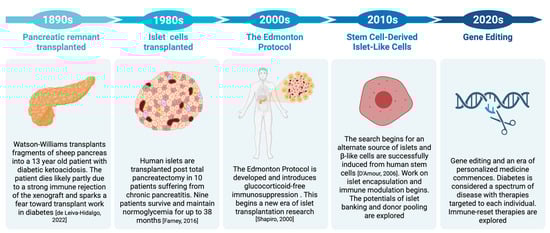 The origin of transplantation as a treatment for diabetes dates back to the 1800s (Figure 2), before islet cells had been isolated and properly understood. Oskar Minkowski is credited with the initial discovery of the pancreatic origin of diabetes after conducting total pancreatectomies in dogs in 1889 and noticing the development of glucosuria immediately postoperatively [5]. Two years later, Emmanuel Hedon furthered Minkowski’s research by auto-transplanting pancreatic remnants subcutaneously into de-pancreatized dogs. His experiments illustrated that if the transplanted remnant remained in place with an adequate vascular supply, the dog would survive. However, as soon as the graft was removed, there was a rapid onset of glycosuria and progression to death [5]. In 1893, Watson-Williams attempted the first pancreatic transplant in humans by transplanting pieces of sheep’s pancreas subcutaneously into a 13-year-old patient with diabetic ketoacidosis [5]. The xenograft experiment failed, and the patient died a few days later, triggering a turn away from focusing on the pancreatic role in diabetes.