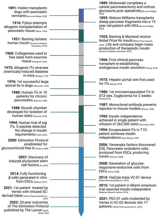 The history of islet cell transplantation (ITx) and landmark discoveries from 1889 to 2021. DKA = diabetic ketoacidosis; ITx = islet cell transplantation; Tx = transplantation; ESC = embryonic stem cell [5,6,7,8,9,10,11,12,13,14,15,16,17,18,19,20,21,22,23,24,25,26,27].