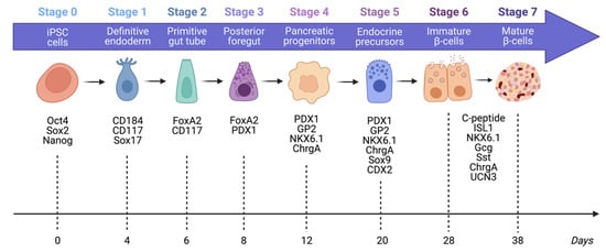The seven stages of differentiation of iPSCs into mature ß-like cells, as well as the time taken to reach each stage in a number of days. At each stage, cells express unique markers, which can be tested to assess the quality of differentiation.