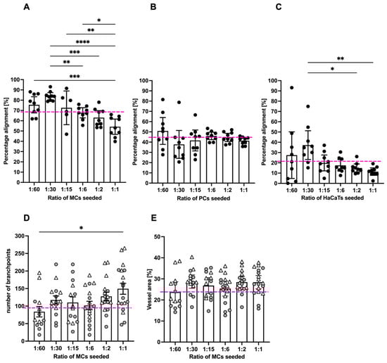 Quantification of mesothelial cell alignment and the effect on endothelial tube formation after 6 days of co-culture. (A). GFP-MCs seeded at ratios of 1:1 to 1:60 with HDMECs showed on average 69% alignment across all seeding densities. Significant differences in percentage alignment were observed amongst different conditions, with the lowest alignment at the highest GFP-MC seeding density. (B). GFP-PCs seeded at ratios of 1:1 to 1:60 with HDMECs showed on average 44% alignment across all seeding densities. There were no significant differences in percentage alignment across the conditions. (C). GFP-HaCaTs seeded at ratios of 1:1 to 1:60 with HDMECs showed on average 21% alignment across all seeding densities. There were significant differences in percentage alignment between 1:30 and 1:1 or 1:2 seeding ratios. Generally, a higher seeding density led to a lower alignment. (D,E). The presence of GFP-MCs in the co-cultures led to an increase in branch points with increasing GFP-MCs seeded (D), and a slightly larger vessel area in the endothelial network, but without significant difference. In (A–C), the pink stippled line indicates the average values across each condition; and in (D,E), the pink stippled line demarcates the control values for branch points and percentage vessel area in the absence of GFP-MCs. Circles and triangles indicate data points from two independent experiments. Data were analyzed by one-way ANOVA with Tukey’s multiple comparison test; data are shown as mean with a 95% confidence interval; significance was defined by a p-value ≤ 0.05. p-value ≤ 0.05 (*), <0.005 (**), ≤0.0005 (***), ≤0.0001 (****).