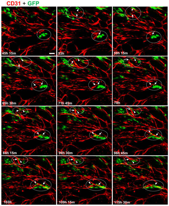 Mesothelial cells interact with endothelial tube formation process at junction points. Collection of individual images captured over a 70 h period, starting from day 2 (45 h, 15 min) of the co-culture. In two areas (encircled), GFP-MC (green, GFP) interaction with branching processes by the HDMECs (red, CD31) leading to junctions in the tubular network are shown. Arrows point toward endothelial-junction-forming process and arrowheads point to GFP-MCs that appear to engage actively by changing their shape into elongated migratory cells. Scale bar 100 μm.