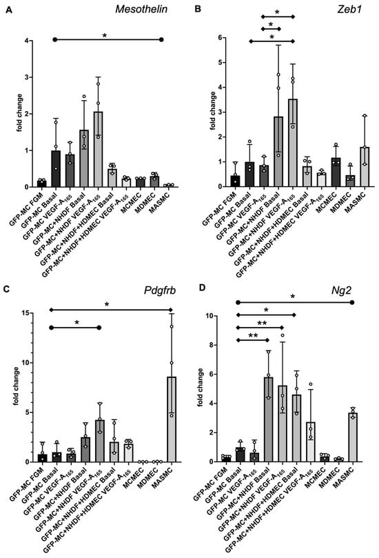 Changes in gene expression of GFP-MCs in response to VEGF-A165 stimulation, co-culture with NHDF, or in the angiogenesis assay after 6 days of culture by qRT-PCR. (A). There was no statistically significant difference in Mesothelin expression for any combination when compared to GFP-MC Basal using a one-way ANOVA, although a trend to 2-fold higher expression in GFP-MC+NHDF stimulated with VEGF-A165 compared to GFP-MC Basal could be observed. There was a significantly lower expression of Mesothelin in mouse primary arterial smooth muscle cells (MASMCs) compared to GFP-MC basal using an unpaired t-test with p = 0.0421. (B). There was a statistically significant 3.6-fold higher Zeb1 expression for GFP-MC+NHDF stimulated with VEGF-A165 compared to GFP-MC Basal or GFP-MC with VEGF-A165, and a 2.8-fold higher expression in GFP-MC+NHDF without VEGF-A165 compared to GFP-MC Basal using a one-way ANOVA with Tukey’s multiple comparison test. (C). Expression analysis for Pdgfrb revealed a statistically significant 8-fold higher expression in MASMCs compared to GFP-MC Basal using a one-way ANOVA with Tukey’s multiple comparison test. Pdgfrb expression was 4-fold higher in GFP-MC+NHDF with VEGF-A165 compared to GFP-MC Basal; this was significant when using an unpaired t-test. (D). Ng2 was significantly higher expressed in GFP-MC+NHDF without VEGF-A165 (5.9-fold), in GFP-MC+NHDF stimulated with VEGF-A165 (5.4-fold) and in the GFP-MCs in angiogenesis assay without VEGF-A165 (4.7-fold), compared to GFP-MC Basal using a one-way ANOVA with Tukey’s multiple comparison test. There was a 3.4-fold significantly higher expression in MASMCs when compared to GFP-MC Basal by unpaired t-test. Data displayed as geometric mean with geometric SD, significance was defined by a p-value ≤ 0.05. p-value ≤ 0.05 (*), ≤0.005 (**). FGM—full growth media, MCMEC—mouse primary cardiac microvascular endothelial cells, MDMEC—mouse dermal microvascular endothelial cells.