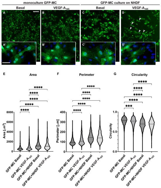 Changes in cell shape of GFP-MCs in response to VEGF-A165 and culture on an NHDF feeder layer. (A–D). GFP-MCs were cultured on plastic (monoculture, (A,B)) or NHDFs (C,D) for 6 days followed by immunofluorescence staining for GFP and DAPI nuclear stain. Scale bars for (A–D) 200 μm; for (A’–D’) 50 μm. (E–G). GFP-stained MCs under the four culture conditions were assessed using the Cellpose workflow and Fiji for area, perimeter and circularity. A Kruskal–Wallis test with Dunn’s multiple comparison tests determined significant differences across the four conditions for the three parameters; data shown as violin plots with median and quartiles. Significance was defined by a p-value ≤ 0.05. p-value ≤ 0.0005 (***), ≤0.0001 (****).