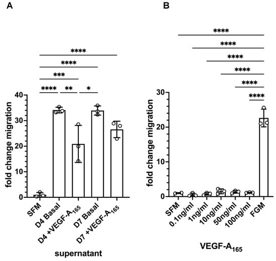 Because we had observed a change in cell shape in the GFP-MCs in response to co-culture with NHDFs and VEGF-A165, we explored the effect of the supernatant from the co-culture of HDMECs and NHDFs on mesothelial cell migration. In a Boyden chamber assay, we found that there was a 34-fold increase in GFP-MC migration over serum-free medium in basal supernatant from HDMEC–NHDF co-culture on day 4 or day 7 (Figure 6A). By comparison, there was a 21-fold or 27-fold increase in GFP-MC migration over serum-free medium in supernatant from HDMEC–NHDF co-culture containing VEGF-A165 on day 4 or day 7, respectively. When serum-free medium was supplemented with VEGF-A165, this failed to elicit a strong migratory response compared to full-growth media (Figure 6B).