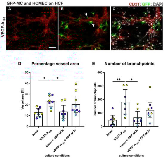 MCs align with HCMECs in angiogenesis co-culture. HCMECs (CD31, red) were cultured on HCF with GFP-MCs (GFP, green) in medium containing VEGF-A165. Nuclei were labeled with DAPI and are shown in white. Addition of GFP-MCs (ratio 1:60) to HCMEC-angiogenesis cultures in medium with VEGF-A165 (A–C) revealed alignment of the MCs to the tubes. Arrowheads in (B) point towards GFP-MCs that align with HCMECs. (D,E). Quantification of angiogenesis of HCMECs on HCFs and with/without GFP-MCs. Percentage vessel area and number of branch points are highest when HCMECs are cultured with VEGF-A165. GFP-MCs added to the co-culture resulted in similar values (no statistical significance). Yellow, purple and turquoise represent data points from 3 independent experiments, and data are shown with a 95% confidence interval. Scale bar 100 μm. Statistical analysis by one-way ANOVA with Tukey’s multiple comparisons test. Images representative of three independent experiments. Significance was defined by a p-value ≤ 0.05. p-value ≤ 0.05 (*), ≤0.005 (**).