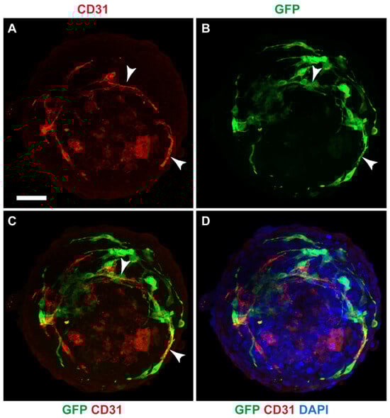 GFP-MCs aligned with HCMECs in a cardiac spheroid model. Immunofluorescence labeling for GFP (green), CD31 (red) and nuclear stain (DAPI, blue). (A–D). GFP-positive mesothelial cells were detected closely aligned with endothelial tubes (arrowheads). Scale 50 μm. Data are presented from one experiment.