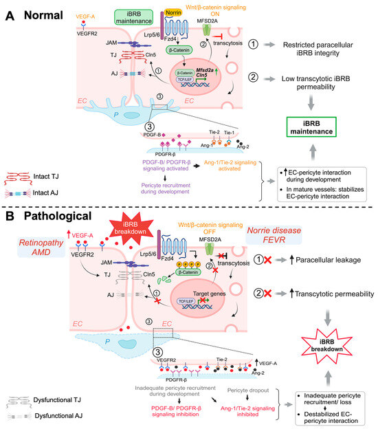 Schematic illustration of multiple signaling pathways important for maintaining iBRB integrity. (A) Normal: Activation of Wnt/β-catenin pathway during development and in adult retinal vessels contributes to the formation and maintenance of iBRB in the vascular endothelium. Under normal (ON) conditions, Wnt ligand (norrin) binds to Fzd4 receptor and Lrp5/6 co-receptor causing stabilization of cytosolic β-catenin, which then functions as a transcriptional signaling molecule by translocating to the nucleus and binding TCF/LEF to mediate target gene expression. Wnt/β-catenin signaling increases expression of TJ component gene Cln5 to limit paracellular permeability and also restricts EC transcellular transcytosis by activating transcription of Mfsd2a, hence maintaining iBRB integrity. In addition, β-catenin also strengthens EC adhesion as a structural component of adhenrens junctions. Under normal conditions, physiological levels of VEGF through its receptor VEGFR2 signaling sustains and maintains normal vessels. Development and maintenance of iBRB also depends on EC interaction with mural cells including pericytes. During development, recruitment of pericytes by nascent endothelial tip cells occurs through PDGF-B/PDGFR-β signaling, which together with angiopoetin/Tie2/signaling cascade, promoting EC-pericyte interaction. Activation of Tie2/Tie1 signaling also maintains the iBRB integrity in intact adult retinal vessels. (B) Pathological: Under pathological conditions with genetic deficiency of Wnt signaling components, the absence of Wnt ligands (OFF state) results in phosphorylation and proteasomal degradation of cytosolic β-catenin, inhibiting expression of downstream genes such as Cln5 and Mfsd2a, thereby resulting in loss of iBRB and increased vascular leakage. In prevalent vascular eye diseases of proliferative retinopathies and neovascular AMD, increased levels of VEGF act mainly through VEGFR2 to impair TJ components and also affects transcytosis, leading to iBRB breakdown, vascular leakage, and retinal edema. Inadequate pericyte recruitment during development due to impaired PDGF-B signaling and altered Tie2 signaling can both lead to destabilized EC-pericyte interactions, with pericyte dropout being a hall mark of diabetic retinopathy, impairing iBRB. EC, endothelial cell; P, pericyte; Fzd4, Frizzled-4; Lrp5/6, LDL-receptor-related protein 5/6; TJ, tight junctions; AJ, adherens junctions; Cln5, claudin-5; MFSD2A, major facilitator superfamily domain containing 2A; TCF/LEF, T-cell factor/lymphoid enhancer factor; PDGF-B/PDGFR-β, platelet-derived growth factor B/PDGF-receptor-β; Tie-1/-2, tyrosine kinase receptor-1/2; Ang-1/-2, Angiopoetin-1/-2; VEGF-A, vascular endothelial growth factor A; VEGFR2, VEGF receptor 2; iBRB, inner blood–retinal barrier. Figure was created with BioRender.com.