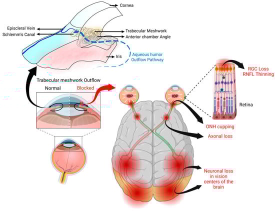 POAG involves the dysfunction of several ocular tissues (Figure 1). Biomechanical stress and altered cytokine signaling in the TM results in abnormalities of the normal aqueous humor outflow pathway. In glaucoma, there is an increase in the thickness of the elastic fiber network and anterior elastic tendons of the ciliary muscle along with the extracellular matrix (ECM) deposition in the TM. Due to the loss of TM cells, there is a fusion and thickening of the trabecular lamellae, a narrowing of intertrabecular spaces and collector channels, and a thinning of Schlemm’s canal lumen [18,19]. The actin cytoskeleton in the TM and ONH becomes reorganized, which further contributes to the pathophysiology of glaucoma [20,21]. It should be noted that these same glaucomatous changes to the TM also occur in GC-OHT (see Section 3 for details). Axonal damage at the ONH causes the progressive loss of RGCs and optic nerve axons with characteristic defects in the visual field. The visual pathway consists of two parts, the anterior visual pathway (the retina, optic nerve, and optic chiasm and lateral geniculate nucleus (LGN)) and the posterior visual pathway (optic radiations and visual cortex) [17]. The primary site of damage in glaucoma is at the optic nerve head region, consisting of RGC axons, blood vessels, connective tissues, and glia. At this region, the perforated sclera is more susceptible to the damage, which results in the lamina cribrosa deformation and remodeling, and these changes progressively decrease axonal transport [22]. The deprivation of brain-derived neurotrophic factor may result from retrograde axonal transportation deficits. The high energy demands for the proper functioning of these neurons cannot be maintained, and ultimately lead to the neurodegeneration of RGCs and their axons. The clinical manifestation of glaucoma includes an increased optic cup-to-disk ratio, reduced retinal nerve fiber layer thickness, notch at the neural rim, hemorrhage at the optic disc margin, and characteristic visual field defects [23].