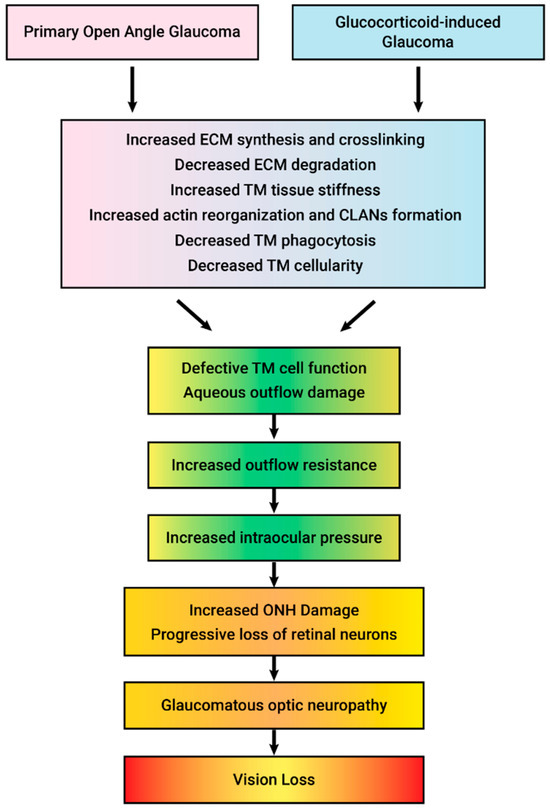 Clinical and molecular similarities between primary open-angle glaucoma (POAG) and glucocorticoid-induced glaucoma. In both diseases, the fibrosis of the trabecular meshwork (TM) increases aqueous humor outflow resistance, resulting in increased intraocular pressure that damages the optic nerve head causing optic neuropathy and loss of vision.