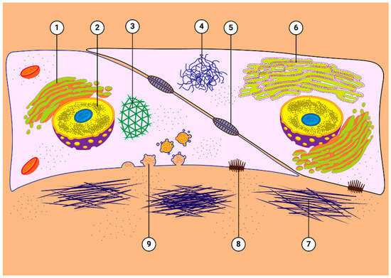 Effects of GCs on TM cells. GCs have a variety of effects on TM cells, including: (1) the proliferation of the Golgi apparatus; (2) enlarged and pleomorphic nuclei; (3) increased cross-linked actin networks (CLANs); (4) microtubule tangles; (5) altered expression and localization of cell–cell junctional complexes; (6) proliferation of rough endoplasmic reticulum; (7) increased deposition of extracellular matrix material around cells; (8) altered expression of integrins; and (9) increased numbers of electron lucent fusion vesicles. Figure derived from Wordinger and Clark [26].