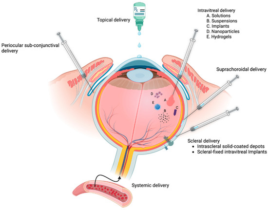 Various ocular delivery routes for anti-inflammatory GCs. Topical ocular delivery is used to treat the ocular surface and anterior segment. Drug depots can be placed adjacent to the eye by periocular sub-conjunctival injections, superchoroidal injections or intrascleral injections. Intraocular delivery is often used to treat posterior segment tissues (e.g., retina) by the intravitreal injections of solutions, suspensions, biodegradable implants, nanoparticles, or hydrogels. In addition, there are delivery devices that are surgically implanted and tethered to the sclera. Systemic delivery is sometimes used for sight-threatening inflammation, but the GCs must transit the natural blood–aqueous barrier and blood–retinal barrier (which is sometimes compromised during ocular inflammation). Figure created using BioRender.
