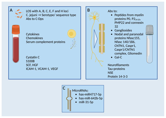 | Diagnostic | Antibodies against Campylobacter jejuni DNA-binding protein (C-Dps) | ELISA, Western Blot Serum | Detection of anti-C-Dps-IgG indicates C. jejuni related GBS | Campylobacter jejuni-related GBS | [6] | Also detected in patients with C. jejuni enteritis (rarely) | |
