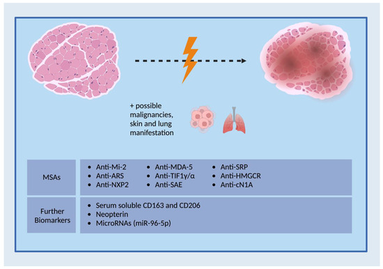 | Diagnostic Prognostic | Anti-HMGCR (3-hydroxy-3-methylglutaryl-coenzyme A reductase) | Immunoprecipitation, ELISA Serum | Significant association with serum creatine kinase Higher serum muscle enzymes than in other IIM Correlation with disease activity Cancer association | MSA 6–12% in IIM | [158,159,160,161,162,163,164,165] | Cave: Statin therapy! | |
