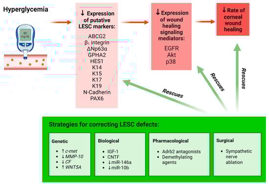 Schematic representation of the effect of hyperglycemia on LESCs. Hyperglycemia results in a significant reduction in the expression of putative LESC markers and the number of cells positive for these markers in the limbus, resulting in delayed corneal wound healing (red highlight). Various genetic, biological, pharmacological and surgical interventions have been employed to rescue LESC function and enhance wound healing in organ-cultured diabetic human corneas, cultured diabetic LECs and mouse models of diabetes (green highlight). Upward arrow () represents “increasing the amount of”; Downward arrow () represents “decreasing the amount of”. Figure generated with BioRender.com.